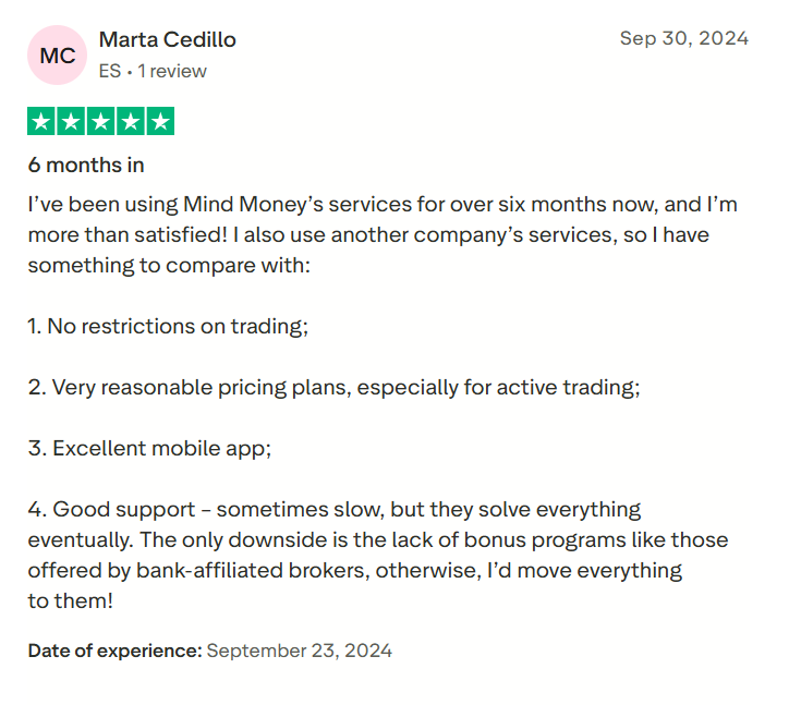 Комиссионная модель прозрачна: нет скрытых сборов, все условия заранее известны. В отзывах Mind Money это один из ключевых плюсов: предсказуемость, отсутствие «подводных камней» и давления со стороны продавцов.